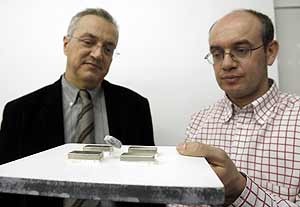 Foto a la derecha: Los investigadores Xavier Obradors (izq.) y Alvar Sánchez muestran con una pieza de uno de los materiales del cable superconductor. (Foto: EFE)
