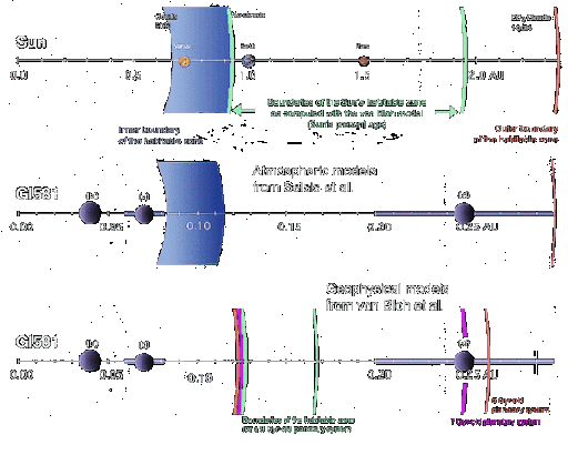 F. Selsis y sus colegas calcularon las propiedades de la atmósfera de un planeta a diversas distancias de la estrella. Si el planeta está demasiado cerca de la estrella, los depósitos de agua se evaporan, y por lo tanto, las formas de vida como las de la Tierra no pueden existir. La frontera exterior corresponde a la distancia en que el CO2 gaseoso es incapaz de producir el fuerte efecto invernadero necesario para calentar una superficie planetaria por encima del punto de congelación del agua. La mayor incertidumbre para la localización exacta de los límites de la zona habitable proviene de las nubes que, de momento, no es posible modelarlas en detalle. Estas limitaciones también se producen cuando se observa el caso del Sol: los estudios climáticos indican que la frontera interior se encuentra en alguna parte entre 0,7 y 0,9 UA, y el límite exterior es entre 1,7 y 2,4 UA. La figura que acompaña el trabajo ilustra las fronteras de la zona habitable del Sol, en comparación con el caso de Gliese 581 como lo comprobaron Selsis y von Bloh.