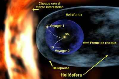 Dibujo ilustrando la estructura que forma el viento solar en torno al Sol. Al alejarse de nuestra estrella y de las órbitas de los planetas, llegamos al frente de choque (esfera semitransparente), lugar en el que el viento solar es frenado fuertemente por la presión del gas situado entre las estrellas. Más allá de esta región se sitúa la frontera final del Sistema Solar, la heliofunda, una enorme región en la que el viento solar es más turbulento y de más alta temperatura (zona púrpura oscura en la imagen). El límite final es aquel en el que el viento solar choca con el material interestelar, forzando a la heliosfera a adquirir forma de lágrima. En la imagen se incluyen las posiciones y trayectorias de ambas sondas Voyager en relación a estas estructuras.