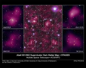 En el mapa se distinguen cuatro agrupaciones principales de materia oscura, cuya masa total equivale a la de 10 billones de soles. Los científicos pudieron localizar y plasmar en el mapa los bloques de materia oscura porque la acción de su masa también curva la luz de más de 60.000 galaxias que se encuentran detrás de 'Abell 901 / 902', en un efecto que se conoce como lente gravitatoria.
