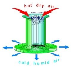 Emplea agua para enfriar el aire en la parte superior de la torre, haciendo que este descienda por el interior de la estructura y ponga en movimiento una serie de hélices ubicadas en su interior. Estas hélices se encargan a su vez de mover los generadores de electricidad. Lo bueno de este diseño es que puede emplearse cualquier fuente de agua disponible, ya sea de un rio, del mar o simplemente la obtenida de los tubos de drenaje de las grandes ciudades. El líquido se transforma en un fino spray que absorbe el calor del aire caliente de la parte superior de la torre, enfriándolo a la vez que el agua se transforma en vapor. Simple, barato, y sobre todo, limpio.